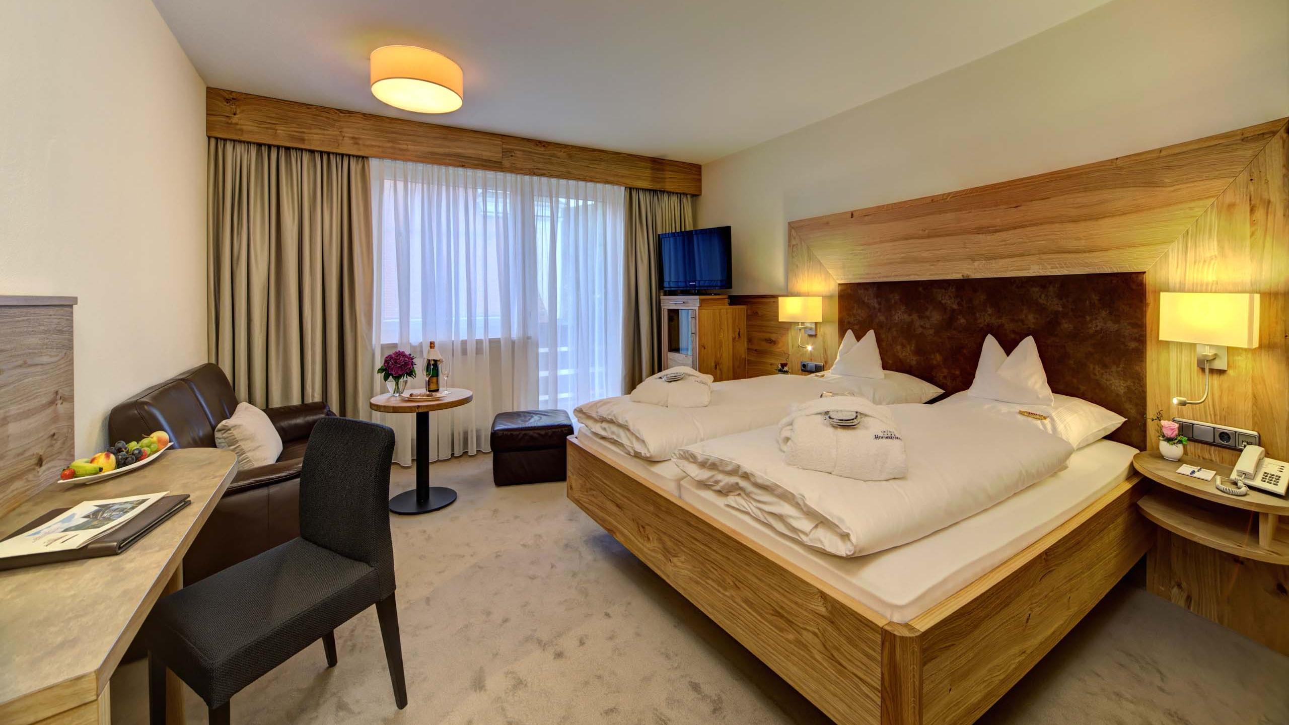 This elegantly furnished room has a double bed and a single bed in a separate room. The room is fully equipped with a shower, toilet, hairdryer, safe, minibar, telephone, and TV with radio. A cosy living area with sofa invites you to linger. Spend quiet hours in the fresh air on the north-facing balcony